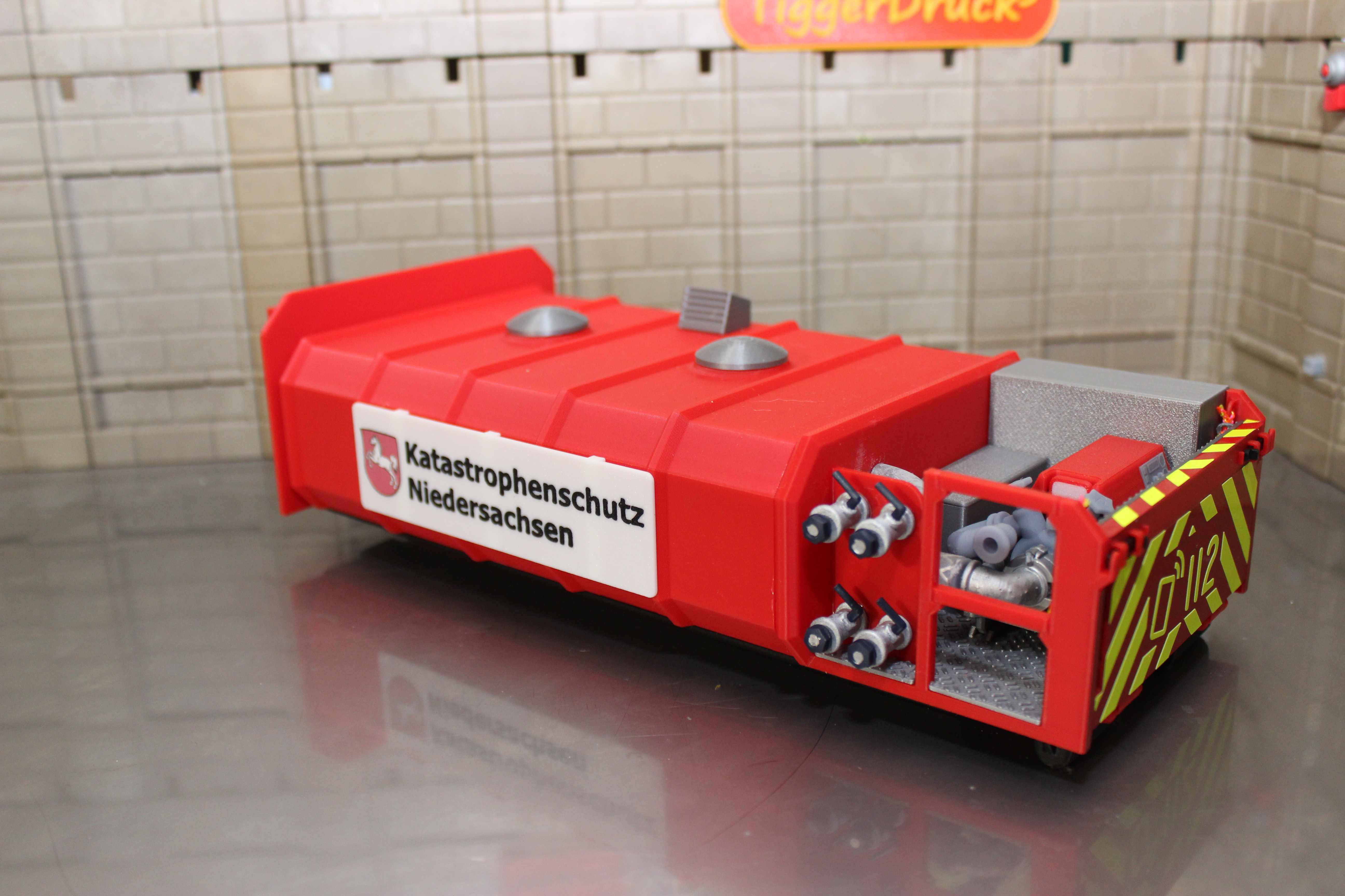 The tailgate can be opened and a ladder extended. Various fittings and other items can be stored in the equipment compartment (not included). The portable fire pump is included (only tested with my version) and can be connected to the tank via a hose (not included).
